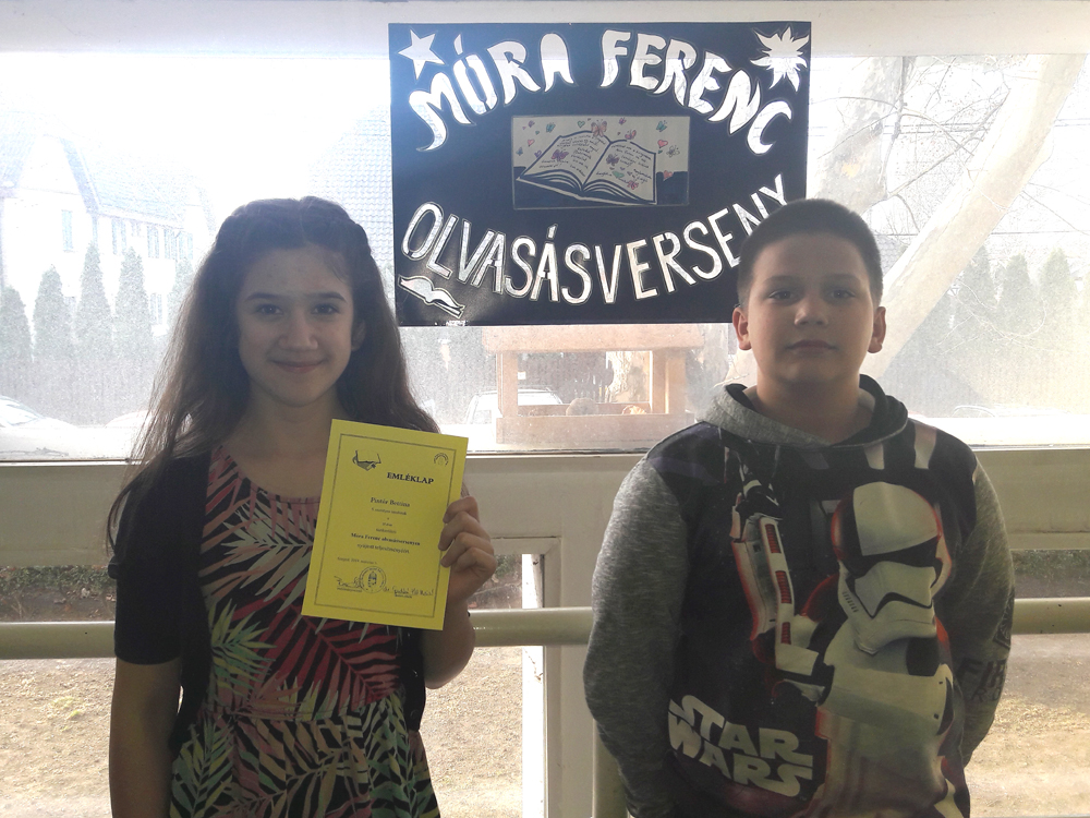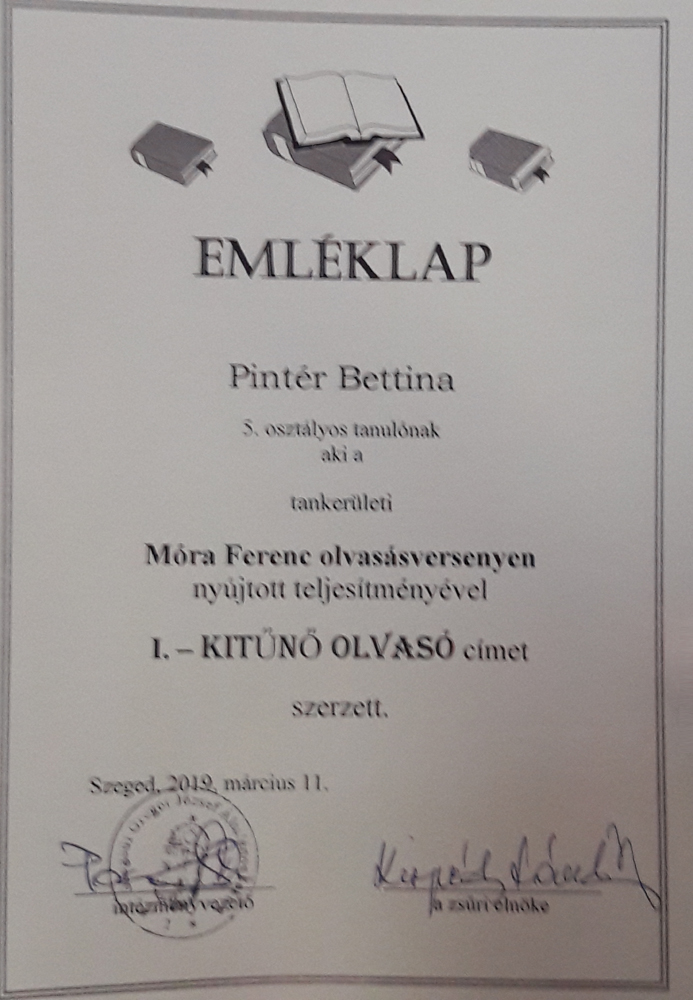 A 25 éves Móra Ferenc Olvasásversenyre idén is a szegedi Gregor József Általános Iskolában került sor. Iskolánkat az 5. osztályos Kiss Barnabás és Pintér Bettina, valamint a 6. évfolyamos Csiszár Csenge és Hódi- Rovó Hédi képviselte. A szövegértési feladatok Móra Ferenc elbeszélése mellett, ismeretterjesztő szöveget is tartalmaztak, így nagy odafigyelésre, kreativitásra volt szüksége a versenyzőknek. A 2. fordulóban hangos olvasásukról adtak számot a gyerekek, ahol rövid felkészülés után a zsűri előtt kellett felolvasniuk Móra egyik novellájának részletét. Tanulóink az Ügyes olvasó, valamint a Kiváló olvasó címekkel térhettek haza, de remek teljesítményének köszönhetően Pintér Bettina 5.a osztályos tanuló az ünnepélyes díjátadóra is meghívást kapott. A szegedi Bálint Sándor Művelődési Házban derült fény arra, hogy Bettina nemcsak a Kitűnő olvasó cím tulajdonosa, de tankerületi 3. helyezett lett összesített eredményével, és hangos olvasásból is a 2. legjobban teljesítő tanuló volt évfolyamában.