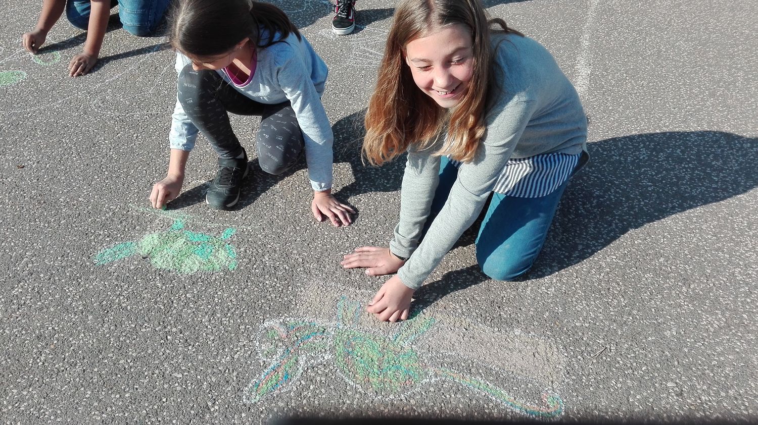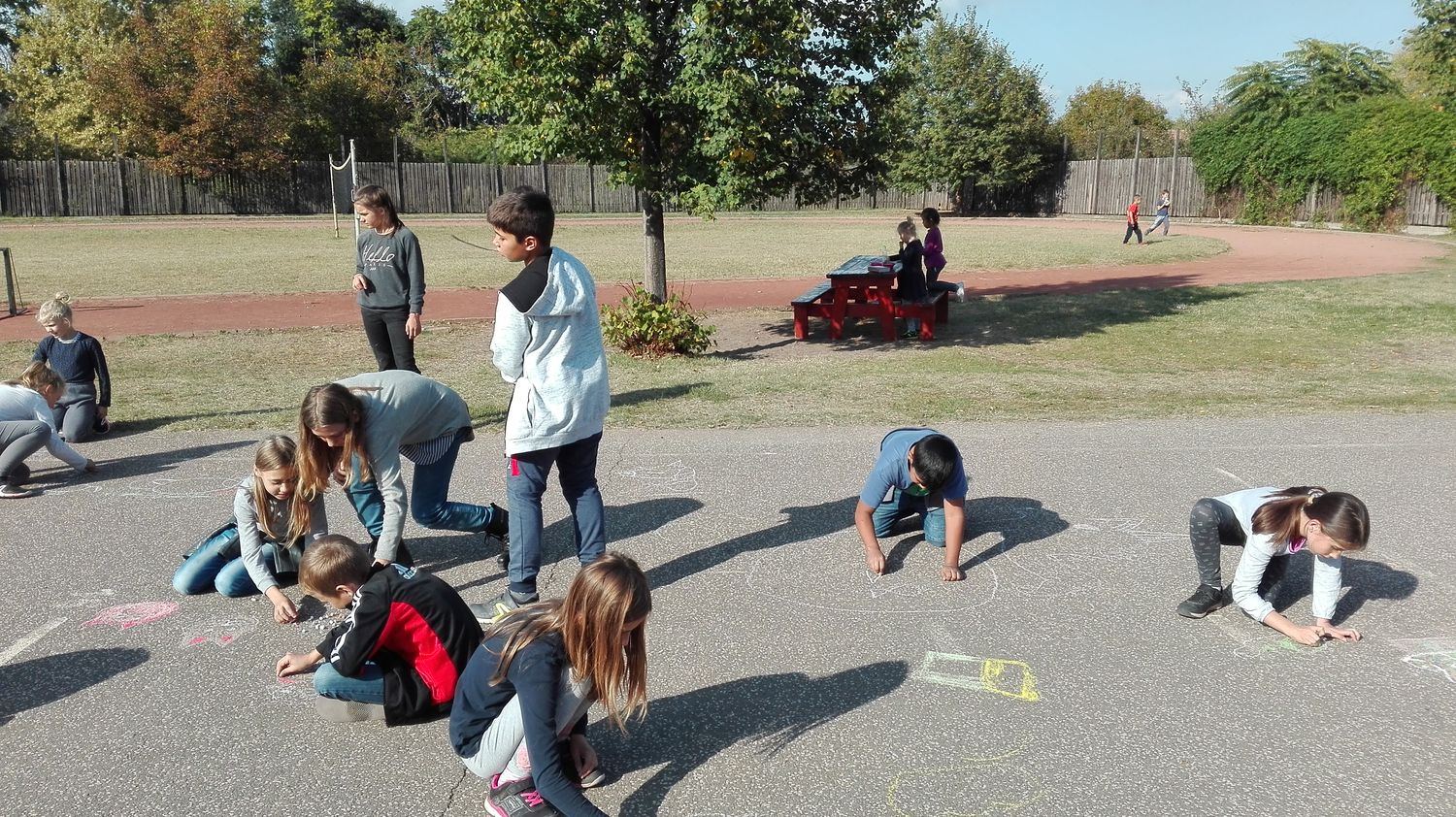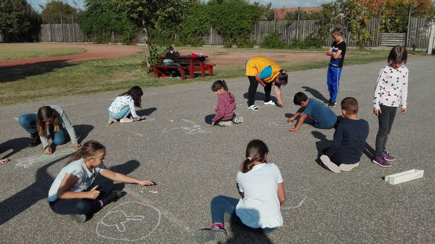 Erhardtné Éva tanítónő színes festővászonná varázsolta iskolánk sportpályáját, ahová nagy lelkesedéssel rajzolták kedvenceiket a gyerekek.