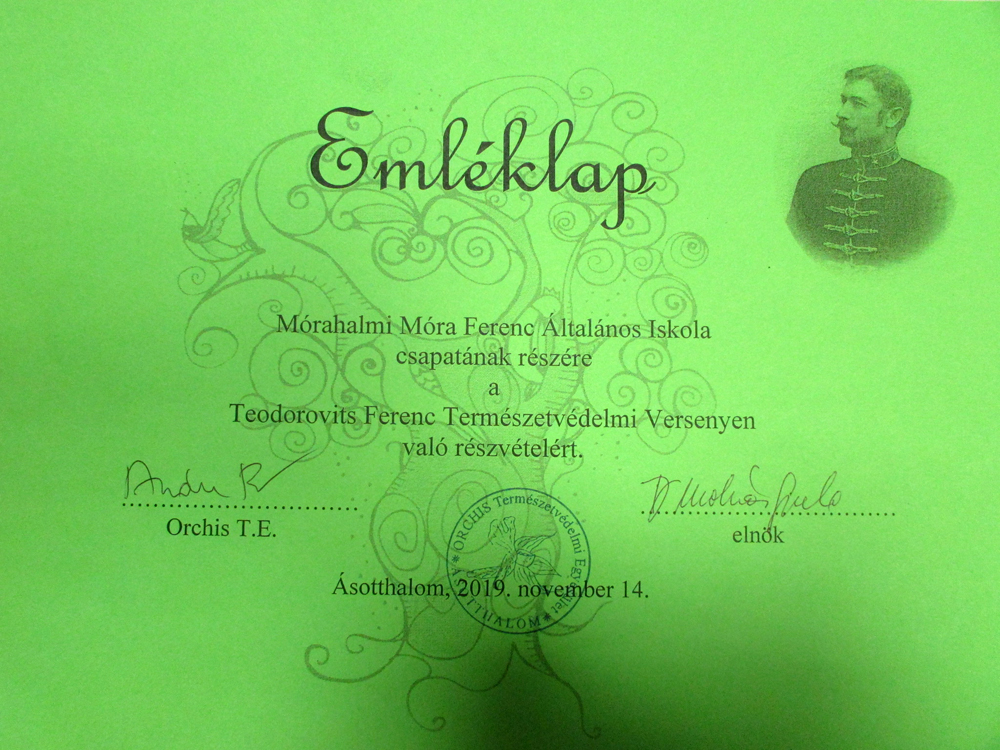 A Teodorovits Ferencről elnevezett versenyt 2019. november 14-én rendezte az ásotthalmi Orchis Természetvédelmi Egyesület. Ebben a tanévben a homokháti kistérség természeti értékei mellett a Duna-Dráva Nemzeti Park alapos ismerete volt a jó helyezés feltétele. Iskolánk csapatának a lelkiismeretes felkészüléssel ez sikerült, hiszen a sok növény- és állatfaj felismerésével, az élőhelyek jellemzőinek megismerésével, a vaktérkép titkainak kifürkészésével I. helyezést értek el.