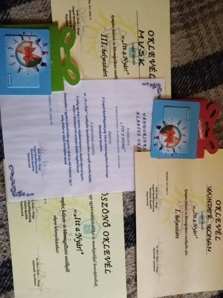 A Szegedi Rendőrkapitányság Városi Balesetmegelőzési Bizottsága Mórahalom Rendőrőrs által szervezett "Itt a nyár" komplex baleset- és bűnmegelőzési vetélkedőn a 6.b osztály eredményesen szerepelt. Iskolánkhoz került a most alapított vándorserleg, egy I. hely, egy III. hely és három különdíj.