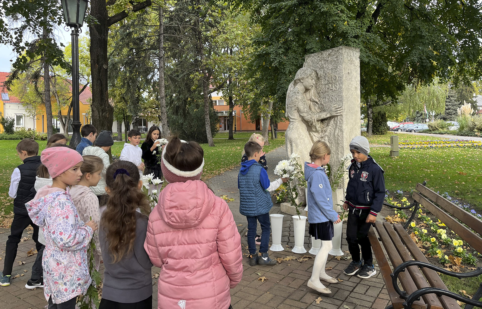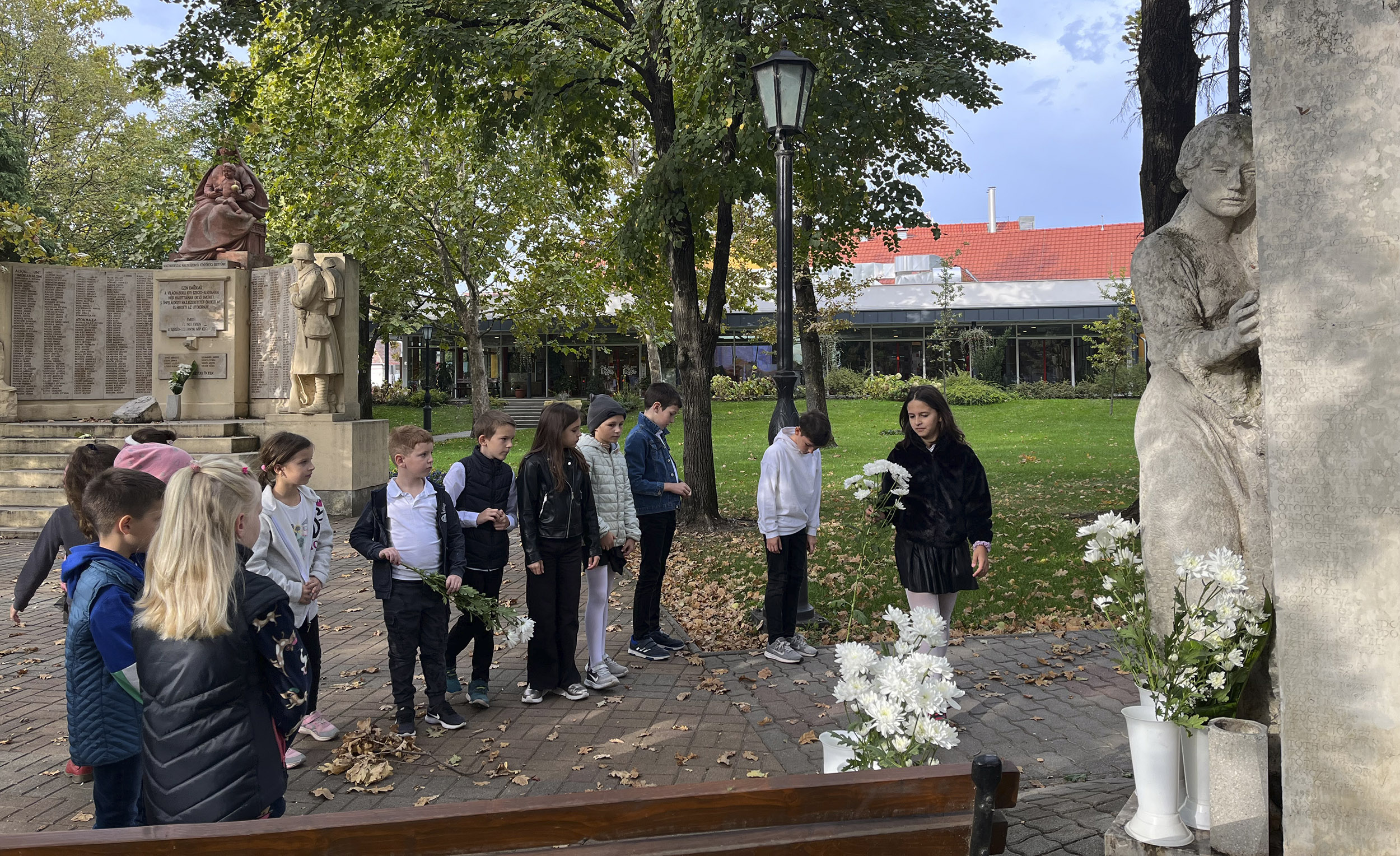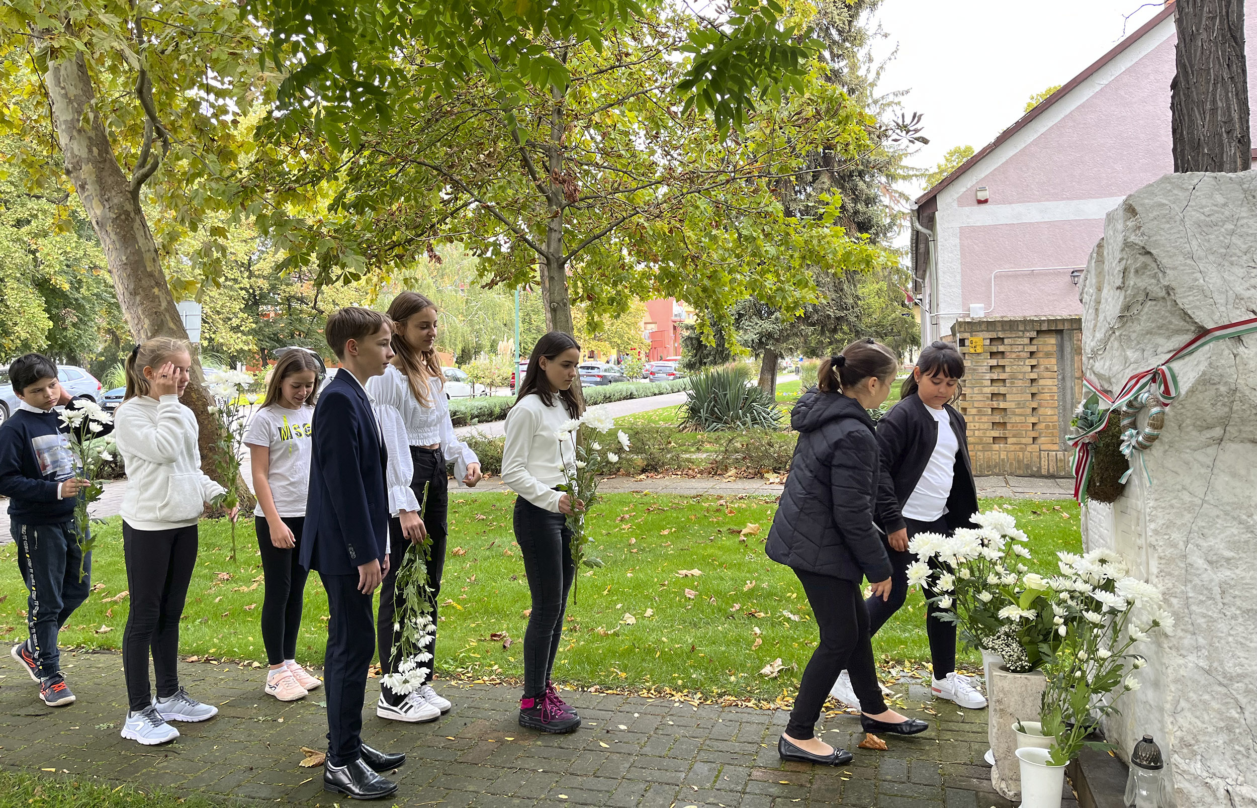 Az ünnepség után hagyományainknak megfelelően az osztályok képviselői elhelyezték a tisztelet virágát a városi emlékműveknél.
