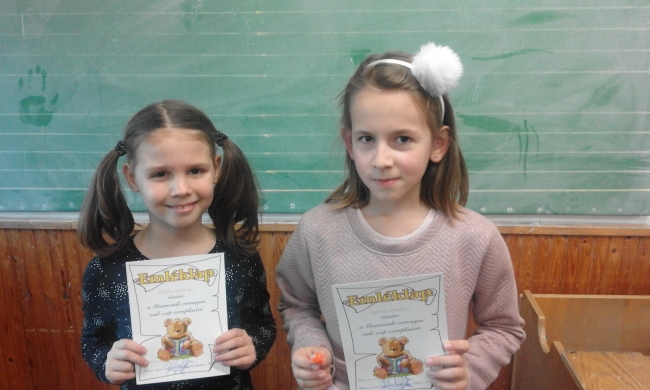 November 27 - én az Üllési Fontos Sándor Általános Iskolában rendezték meg a körzeti mese- és prózamondó versenyt. Iskolánkat 3. osztályos tanulók, Vadász Fanni és Kovács Zsófia képviselte. Zsófi Nógrádi Gábor: Nyúl, míg Fanni Kovács Klára: Szaladj innen! c. művét adta elő. Tanulóink nagy sikerrel szerepeltek. Lelkes mesemondásukat a zsűri dicsérő szavakkal jutalmazta. Gratulálunk! Felkészítő: Németh Mónika