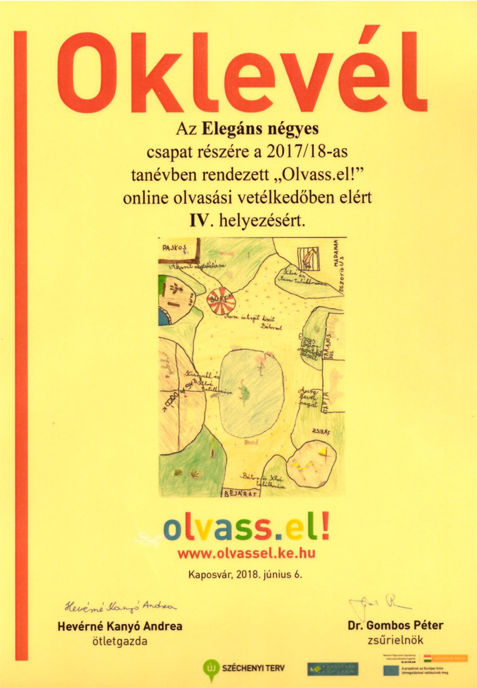 Az Olvass.el! olvasóverseny egy egész tanéven át tartó online vetélkedő. Az évről évre megrendezésre kerülő verseny döntőjét június 6-án rendezték meg, ahová a 32 csapatból az öt legügyesebb juthatott be. A legjobb öt között volt kaposvári, csurgói, dombóvári, mórahalmi és egy felsőtárkányi csapat is. Idén Jeney Zoltán Rév Fülöp című könyvét és Kertész Erzsi Panthera sorozatának első két kötetét kellett elolvasniuk a gyerekeknek. A könyvek alapos ismeretére volt szükség, hisz azokhoz kapcsolódóan kreatív feladatokat kellett megoldaniuk a csapatoknak év közben az online felületen, például térképét rajzoltak és iniciálét terveztek, fogalmazást írtak, keresztrejtvényt fejtettek. A döntőben még egy jelenetet is elő kellett adni az egyik regényből, ami elnyerte a zsűri tetszését is. A Kaposvári Egyetem olvasáskutatója, Dr. Gombos Péter hirdetett végeredményt, ami igen szoros volt, hiszen csak egy-egy pont döntött a csapatok között. Iskolánk Elegáns Négyes csapata: Csiszár Csenge, Dózsa Nikolett, Hódi-Rovó Hédi, Pozsgai Noémi a 4. helyet szerezte meg az országos verseny döntőjében. Felkészítőjük: Madarászné Weinrauch Ivett volt.